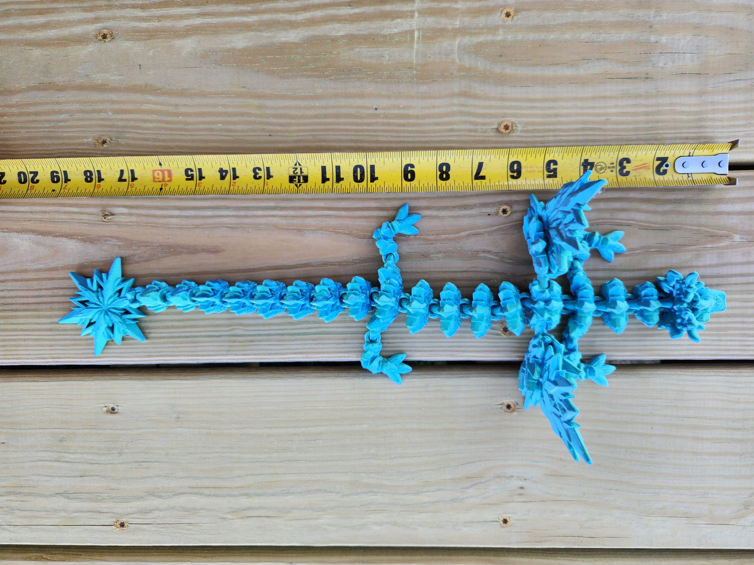 Dive into a realm of frosty fantasy with the Winter Dragon with Wings printed by Rossnell 3D, designed by the talented Cinderwing3D! This breathtaking 24-inch articulated masterpiece is 3D-printed with precision using eco-friendly PLA filament, blending mythical allure with sustainable craftsmanship. Its fully flexible body and wings allow for endless posing possibilities—whether coiled in quiet repose or soaring in imagined flight—making it an ideal fidget toy, striking display piece, or treasured collectible.